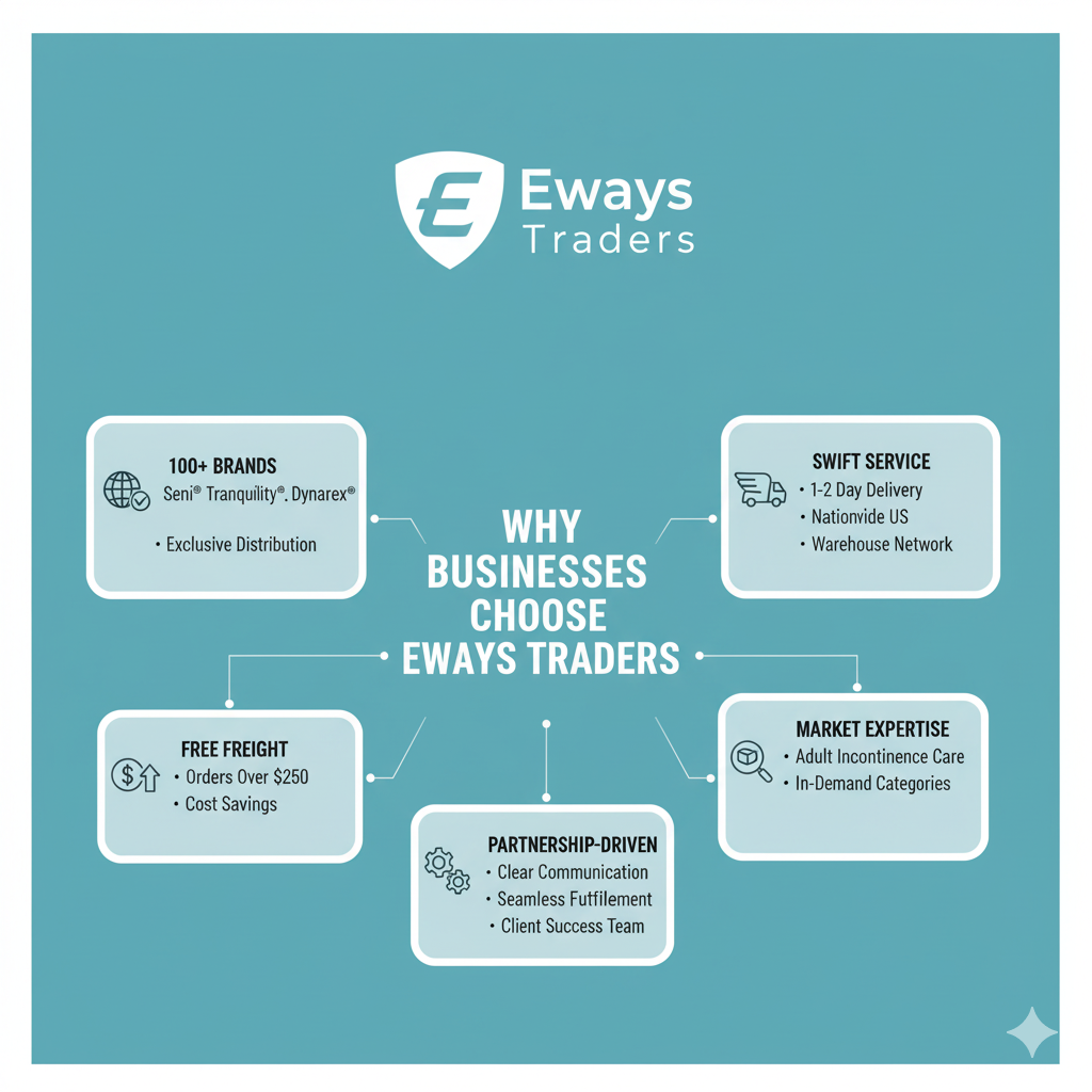 Eways Traders – Your Trusted Wholesale Distribution Partner https://ewaystraders.com/ Eways Traders is a reliable wholesale distributor dedicated to supplying high-quality products to retailers and e-commerce sellers. We specialize in adult incontinence pants, offering dependable, well-packaged inventory to meet ongoing market demand. Our focus on prompt deliveries, clear communication, and seamless fulfillment ensures a smooth partnership for online sellers. While currently centered on this product category, our range is expanding to include additional items in the near future. Authorized Distributor Eways Traders is an authorized distributor of leading brands, including: • Seni® (TZMOUSA Group) • Tranquility® • Abena USA • Dynarex® We supply authentic and reliable medical devices, hygienic and incontinence products, cosmetics, and household care items.