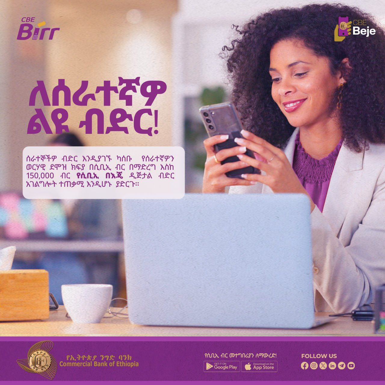 ለሠራተኞችዎ ልዩ ብድር ከሲቢኢ በእጄ! ** እርስዎ ደመወዝ በሲቢኢ ብር ሲከፍሉ ባንካችን ለድርጅትዎ ሠራተኞች እስከ 150 ሺ ብር ብድር ያለምንም ማስያዢያ ያመቻቻል! ከባንካችን ጋር በመሥራት ሠራተኞችዎን ተጠቃሚ ያድርጉ! ** የኢትዮጵያ ንግድ ባንክ ሁሌም የሚተማመኑበት ባንክ! #cbe #cbebirr #cbebeje #digitalbanking •  ለበለጠ መረጃ የሚከተለውን ማስፈንጠሪያ ይጠቀሙ https://combanketh.et/ways-of-banking/cbe-birr